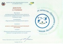 По оценкам экспертной комиссии, в состав которой вошли представители Министерства образования и науки Алтайского края, высших учебных заведений Алтайского края и другие региональные эксперты, Проект «Повышение финансовой грамотности студентов Бийского государственного колледжа» стал победителем в номинации «Перспективный инновационный проект» и удостоен диплома I степени.